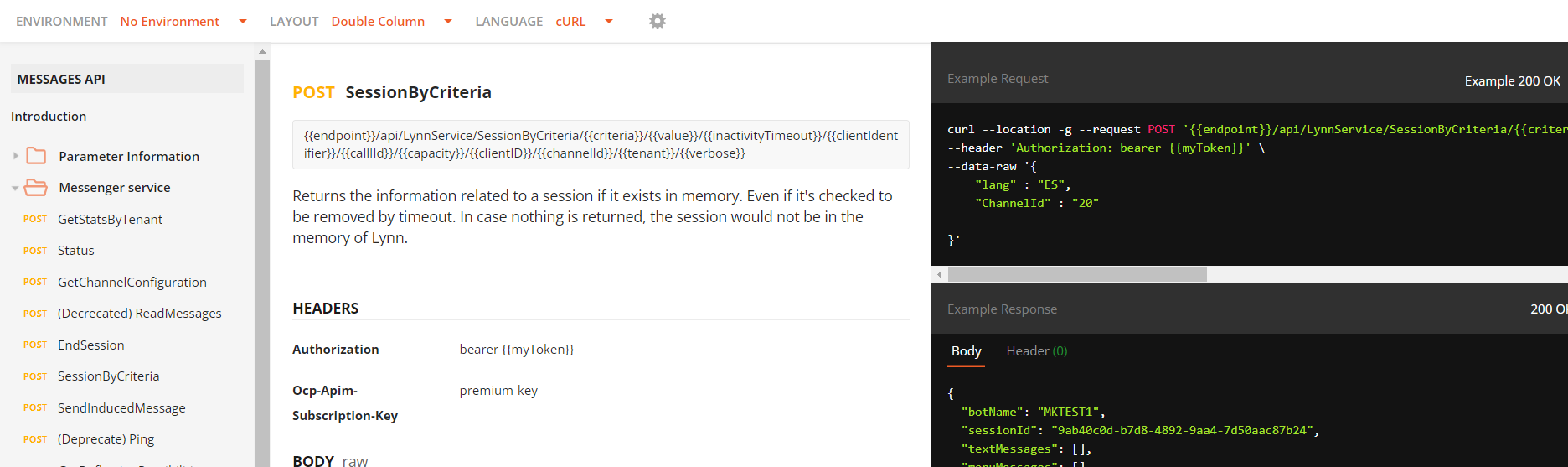 | 200 | Success | Corresponde a una respuesta donde Lynn ofrece todos los mensajes disponibles para el cliente, parámetros importantes: sessionId Identificador de la sesión actual, generada al momento de la creación de la sesión y cuya vigencia será igual a la establecida en el parámetro timeout al momento de crear la sesión. textMessages Lista donde se encuentra data de texto, texto de voz y audio de los mensajes. menuMessages Lista donde se encuentra el título, el título de voz y audio del menú. eventMessages Lista donde se encuentra el evento y el código de los mensajes. awaitingMenu Booleano que indica si el menú está en espera. awaitingText Booleano que indica si el texto está en espera. awaitingValidation Si la validación está en espera, contiene dos string BussinessType, Regex y dos booleanos AvailableByVoice y AvailableByText. awaitingType Tipo de espera. supportCancelation Es un booleano, true: si está activo en la conversación, false: si la conversación es nula o la intención manipulada de la conversación es nula devuelve false. Json Respuesta {
